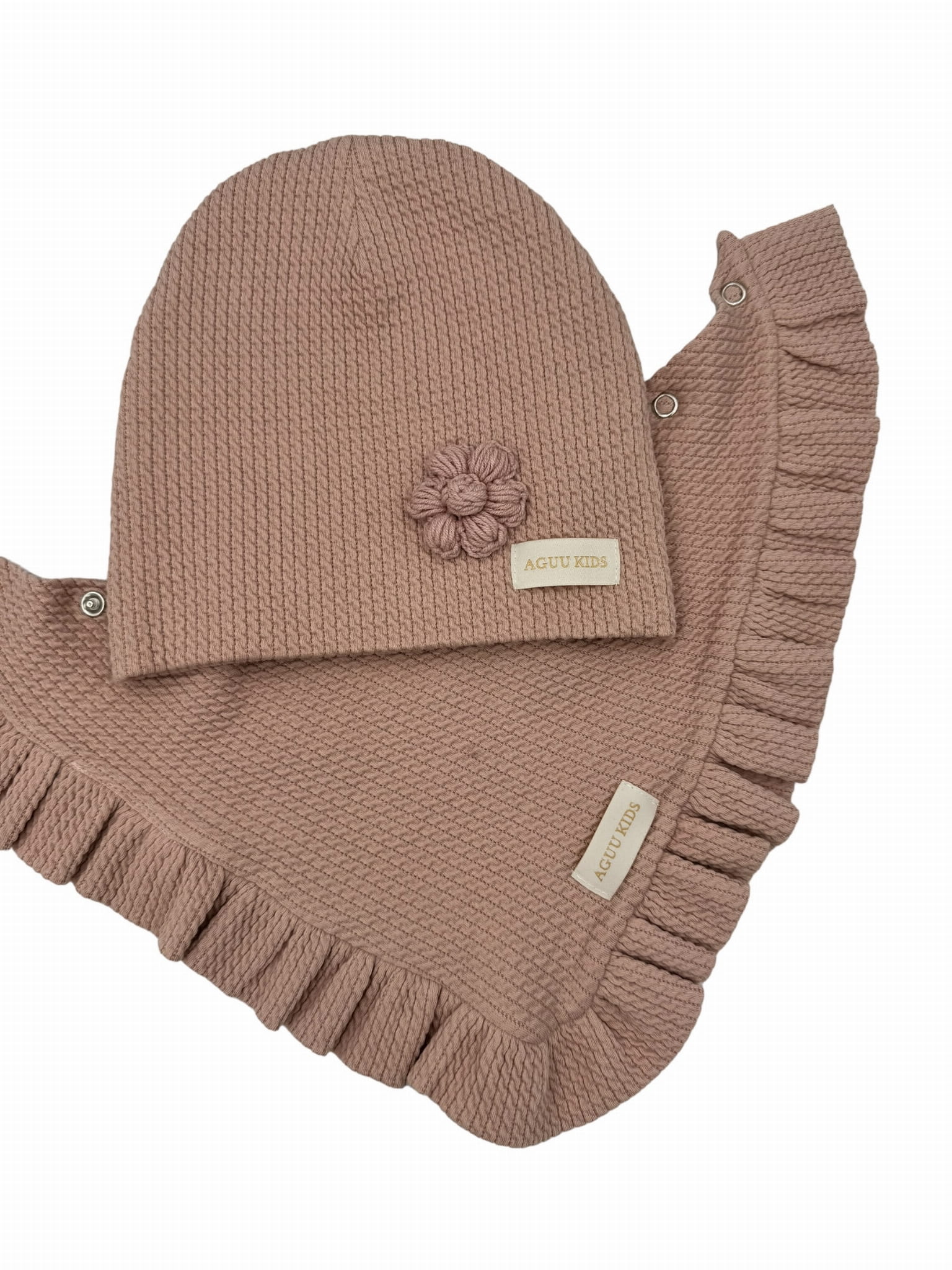 Klasyczna podwójna czapka uszyta z wysokiej jakości bawełny z ręcznie robionym kwiatkiem na szydełku to nasza wiosenna propozycja dla Twojego dziecka.