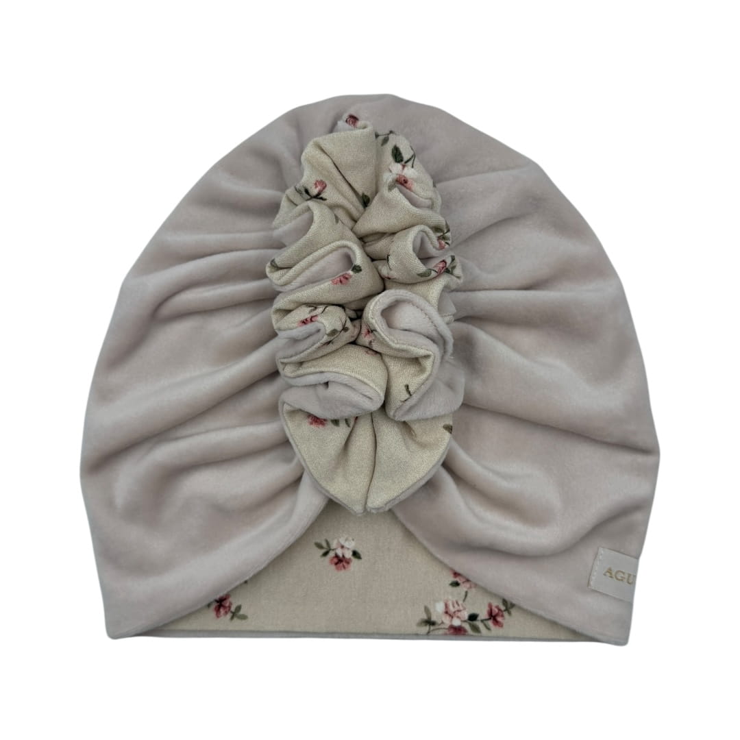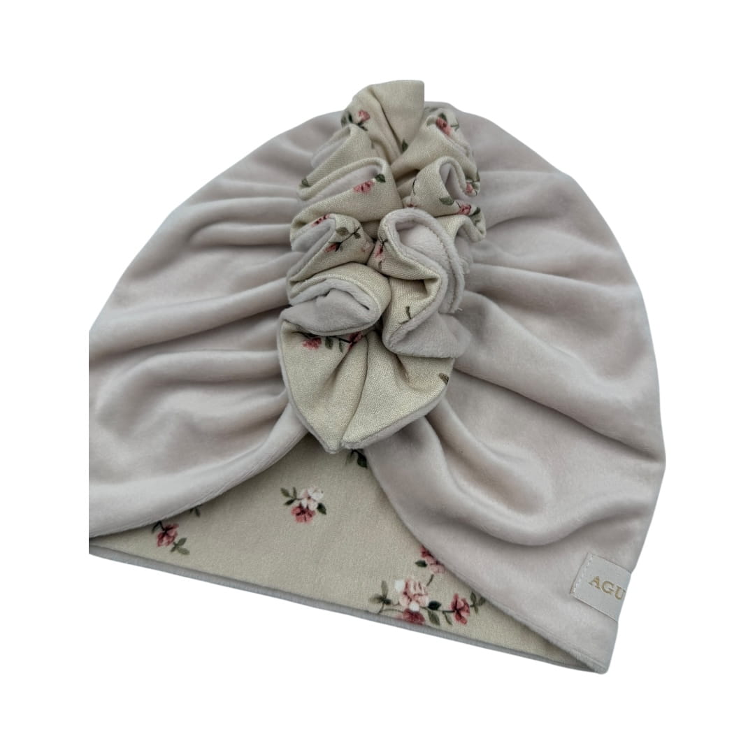 Jesienny podwójny turban falbanka welur beż + drobne różyczki