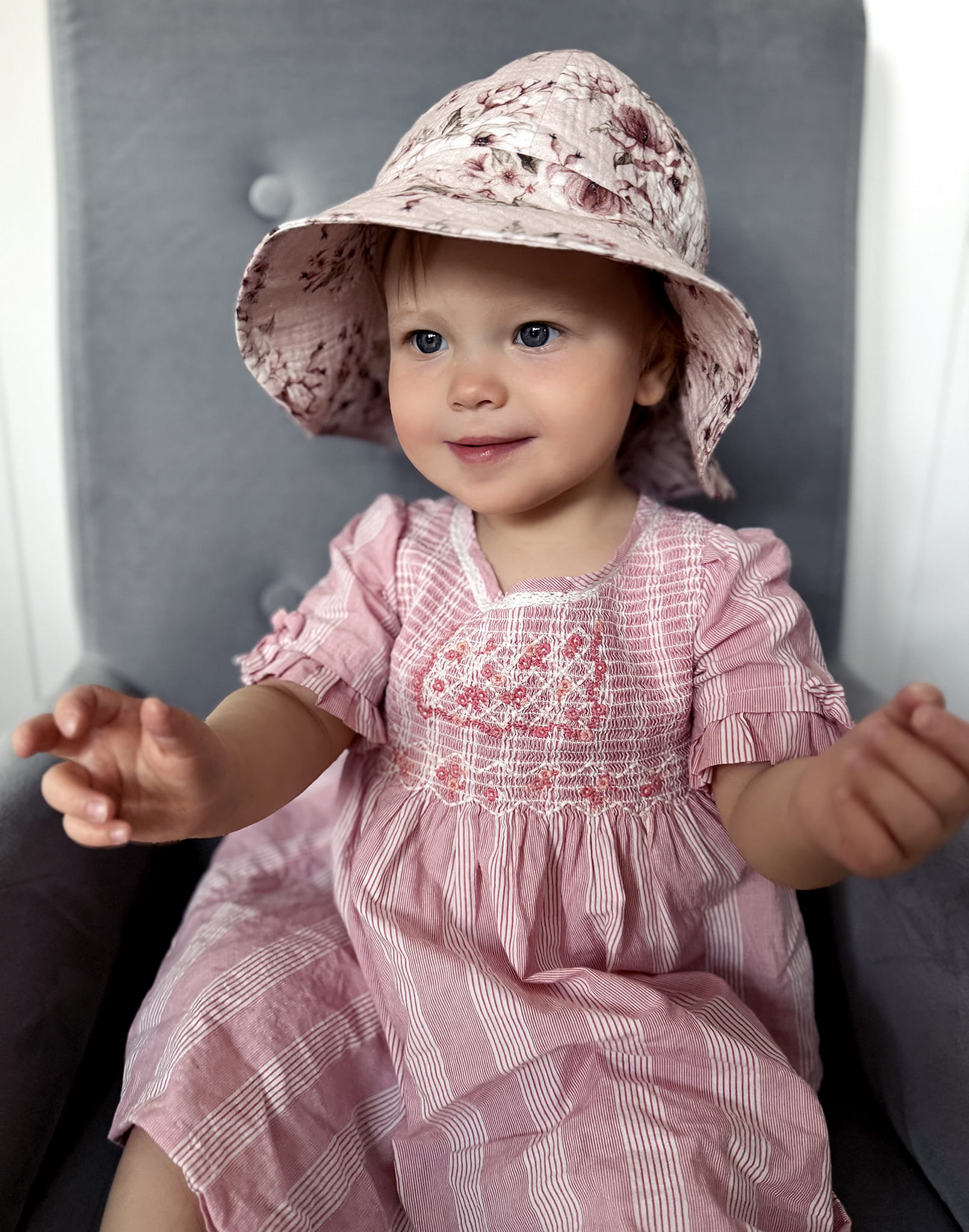 Wykonany z delikatnego, oddychającego bawełnianego muślinu, kapelusz jest miękki, przyjazny dla wrażliwej skóry i niezwykle lekki. Dzięki szerokiemu rondzie skutecznie chroni buzię i kark przed słońcem, a wiązanie pod brodą gwarantuje, że nie zsunie się podczas zabawy.