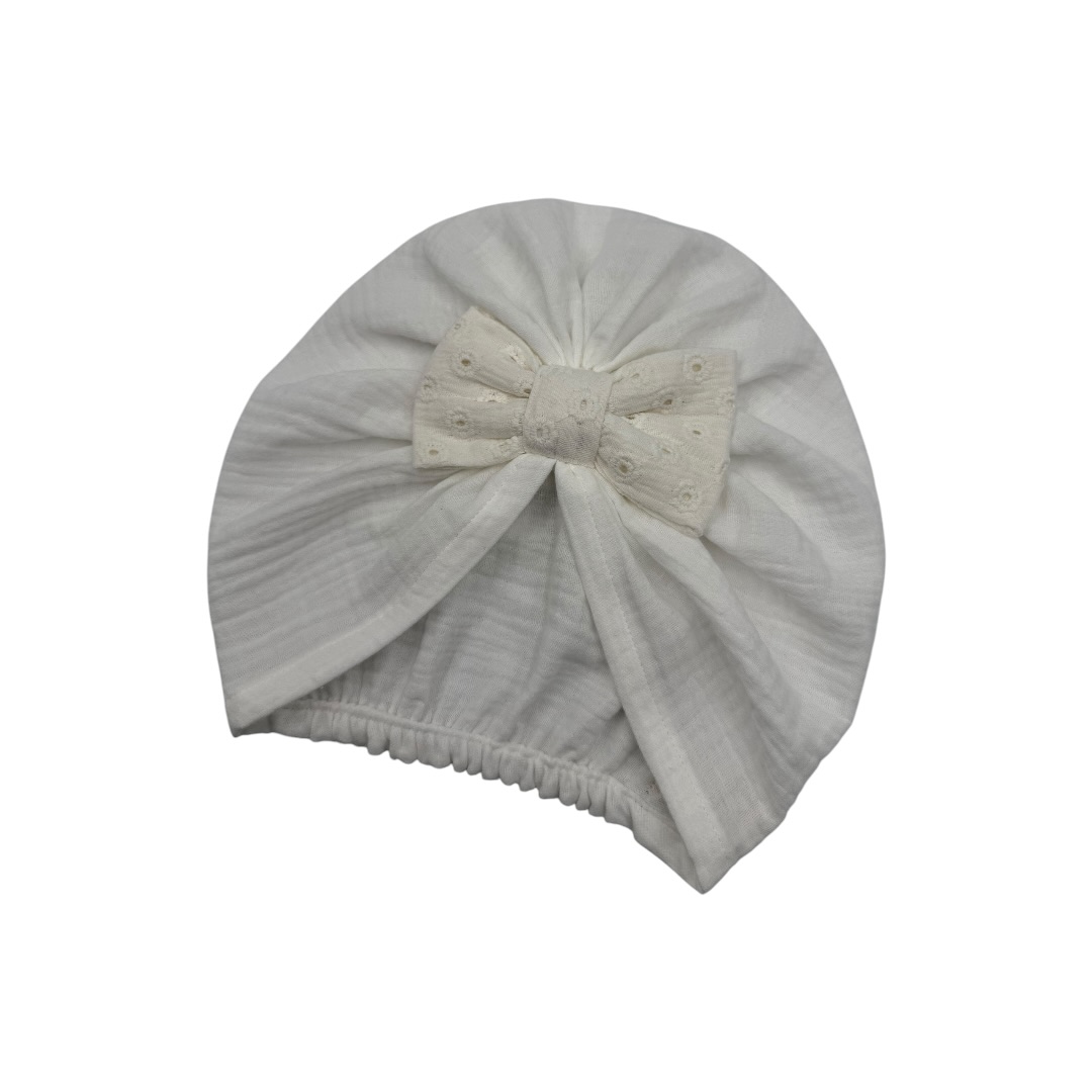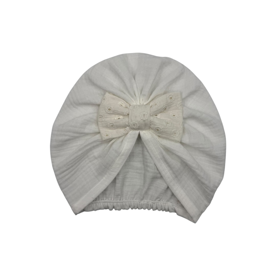 Muślinowy turban z haftowaną kokardą ecru lato 26