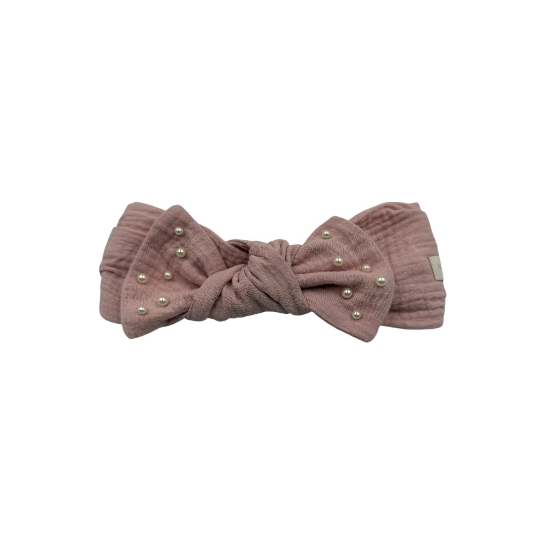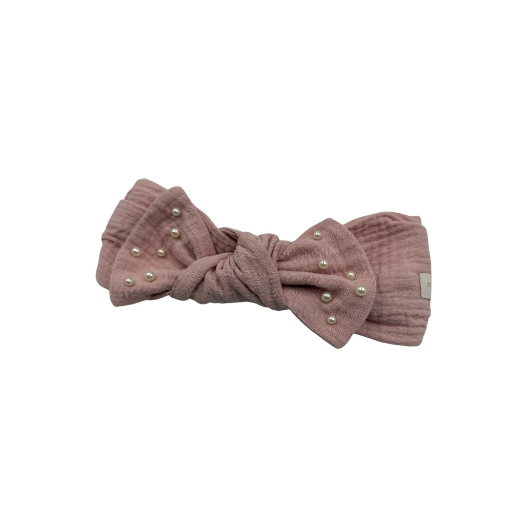 Opaska dla dziewczynki z kokardą i perełkami 100% muślin pastelowy