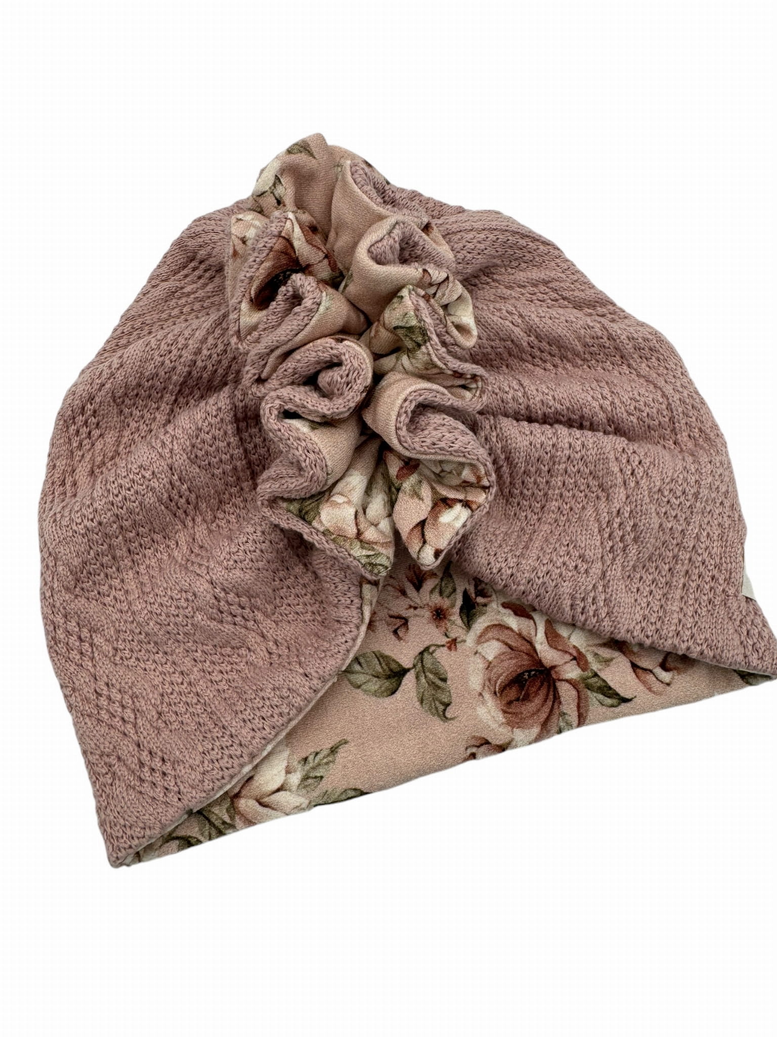 Sweterkowy turban falbanka z kwiatowym motywem