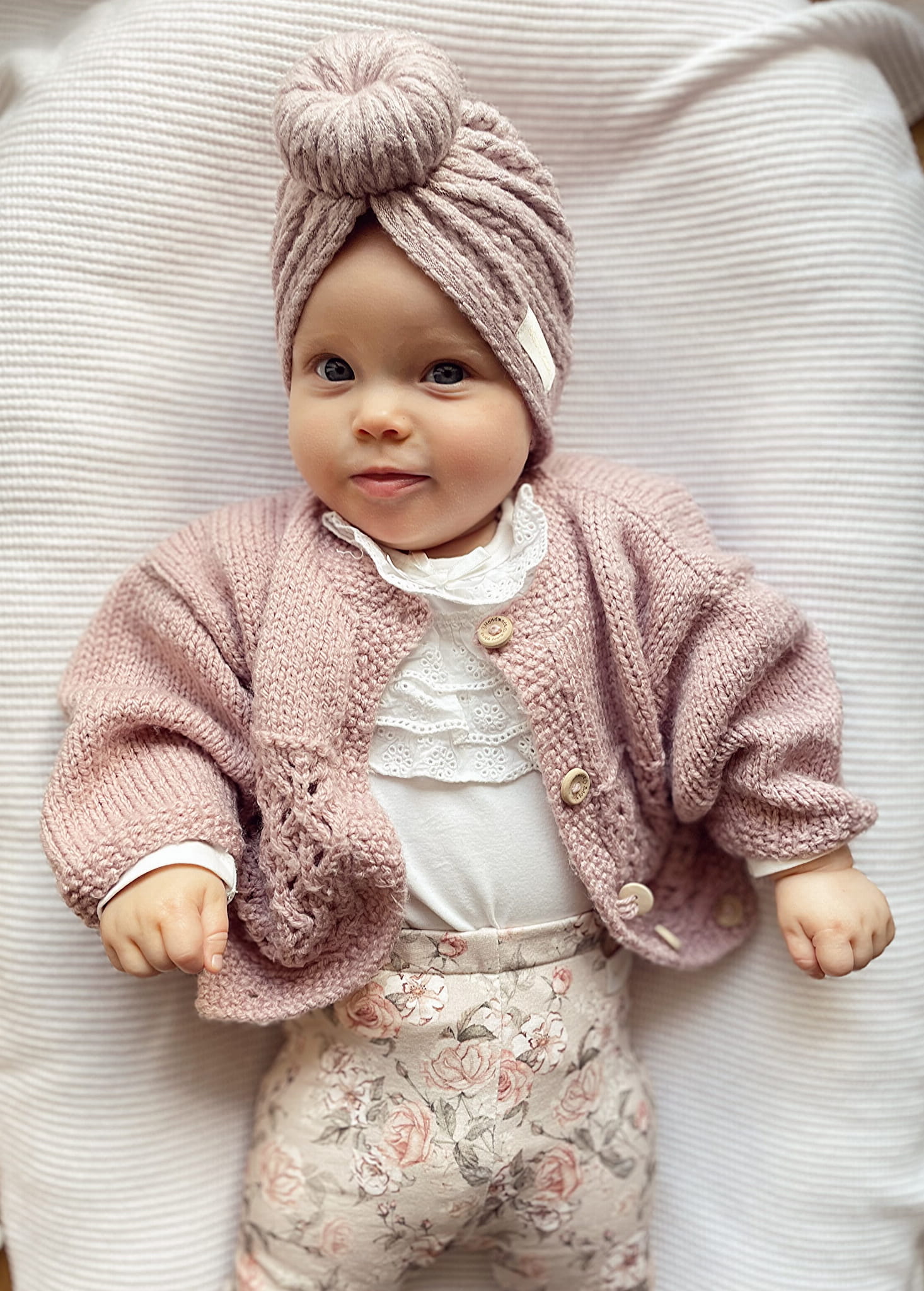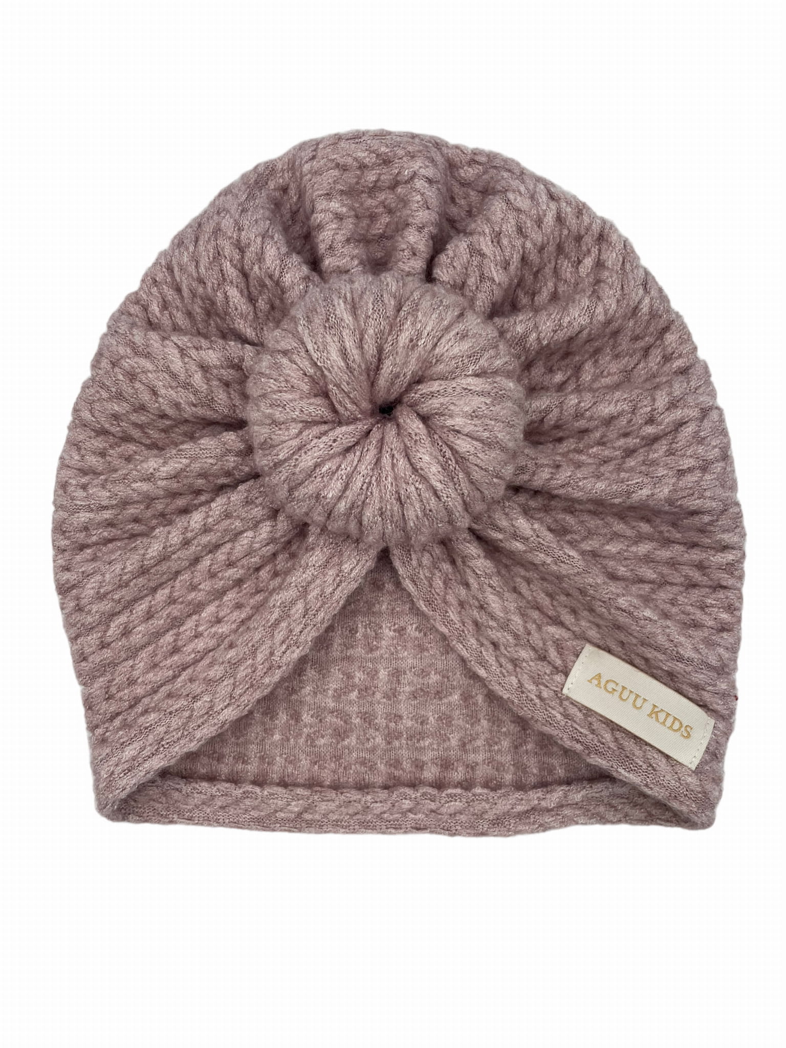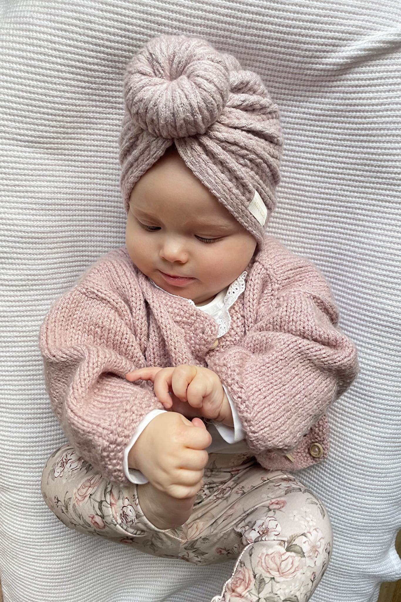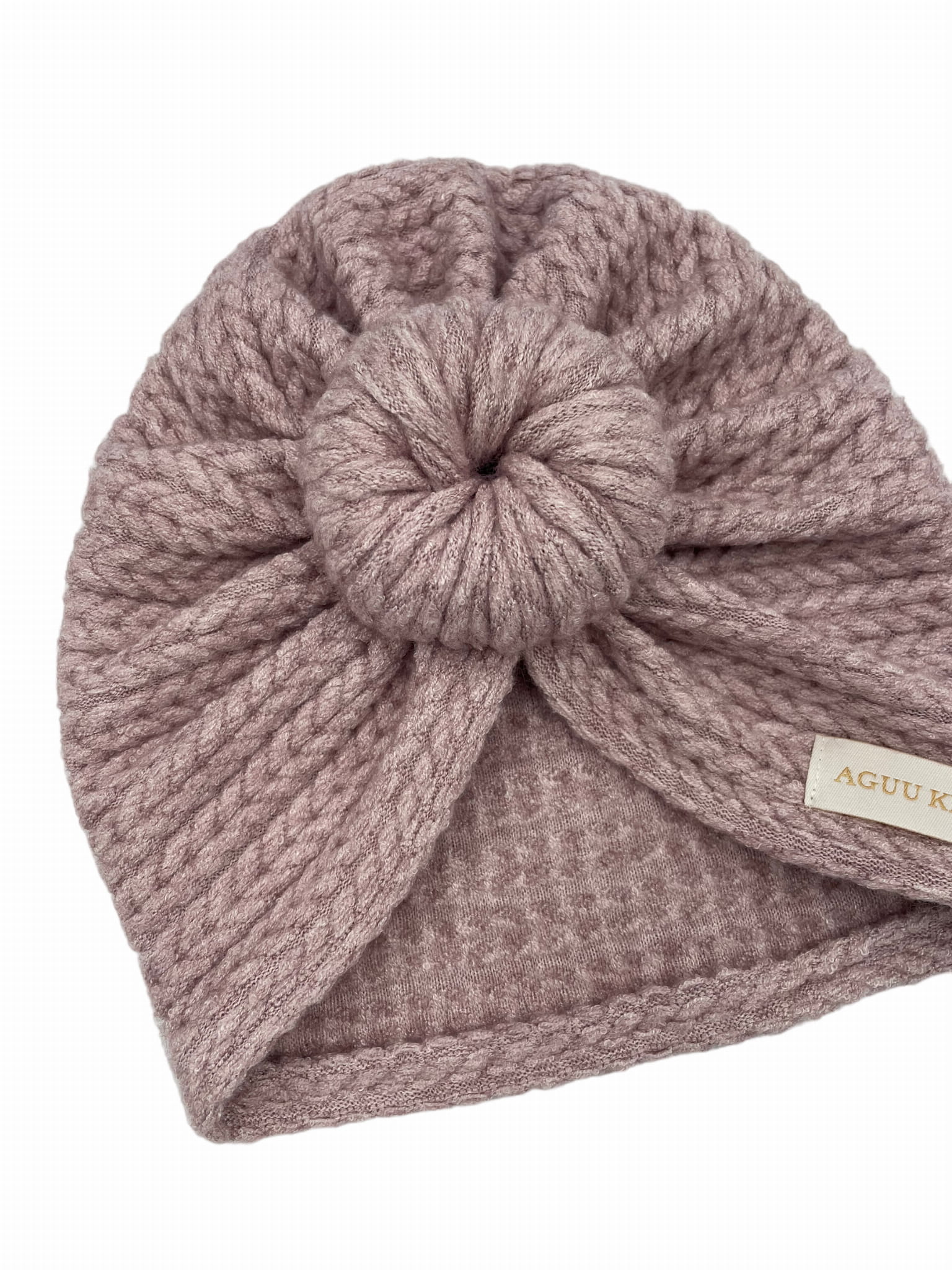 Turban uszyty jest z dzianiny o bardzo charakterystycznym splocie warkocz. Jest niezwykle miękki i przyjemny w dotyku. Elastyczność dzianiny sprawia, ze turban idealnie dopasowuje się do głowy.