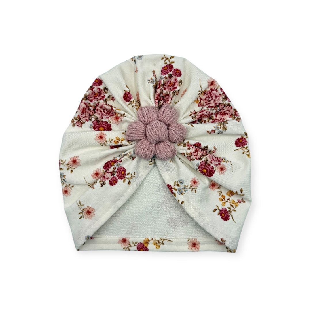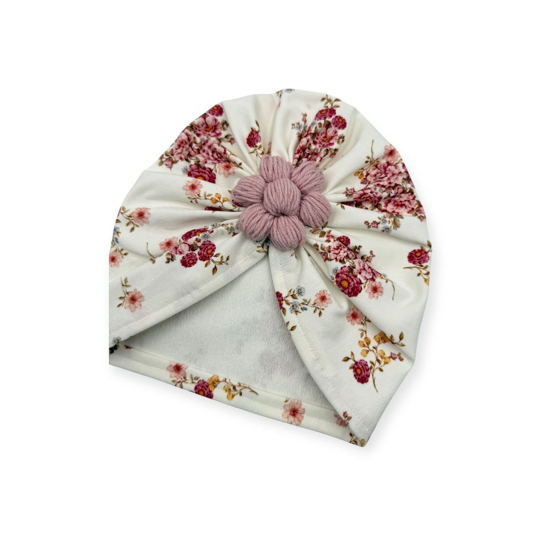 Turban dziecięcy w kwiaty z ozdobnym kwiatkiem- czapka dla dziewczynki
