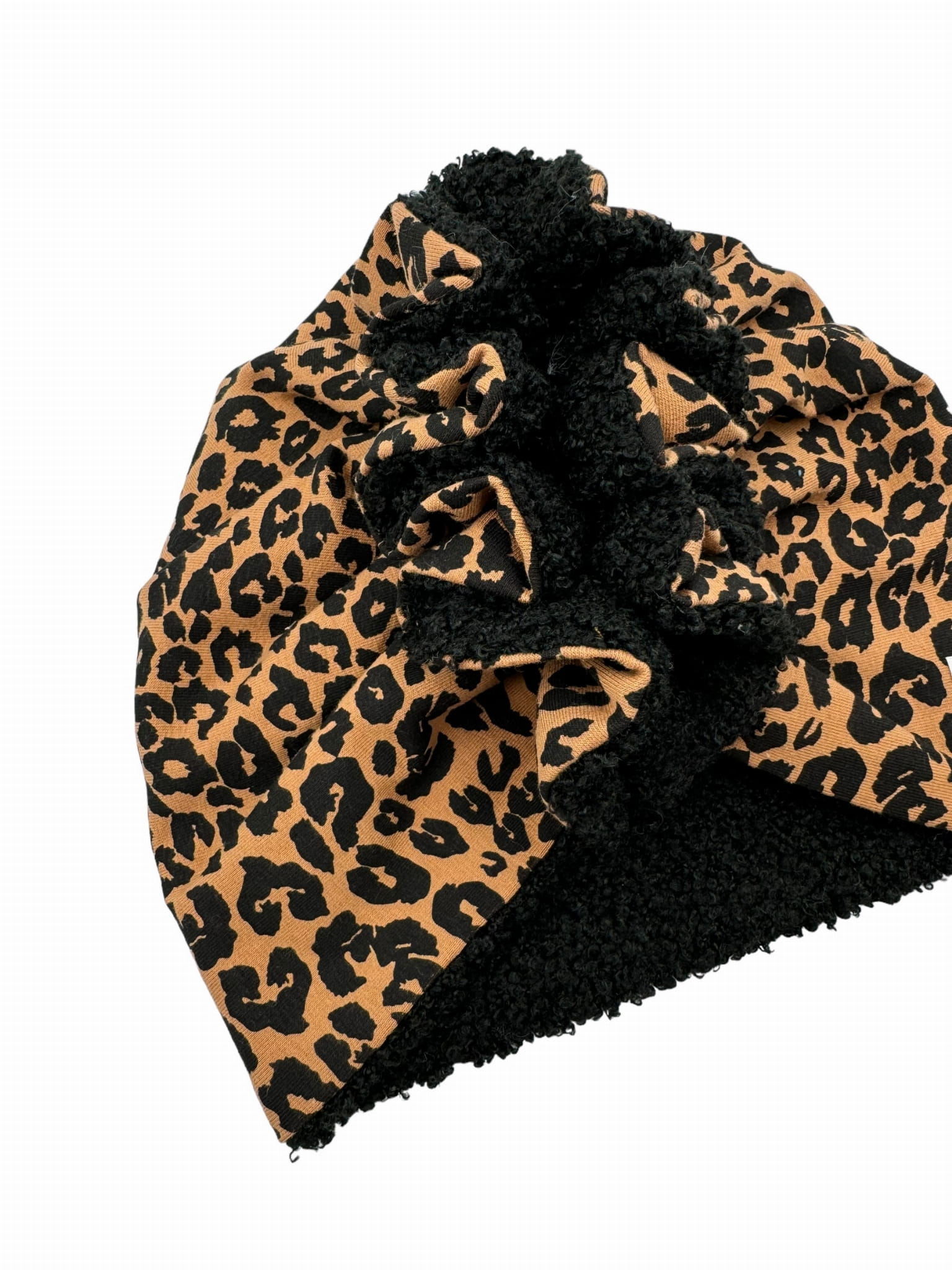 Uszyty jest z podwójnej warstwy materiały modnego baranka oraz dzianiny panterka