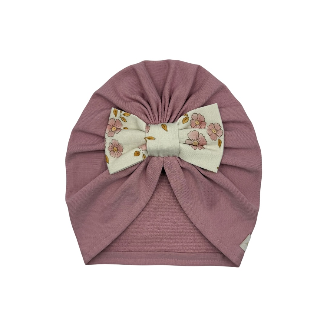 Stylowa czapka turban niemowlęca w kolorze pudrowego różu z ozdobną kokardą w kwiaty. Miękka, bawełniana i wygodna – idealna na co dzień i wyjątkowe okazje.