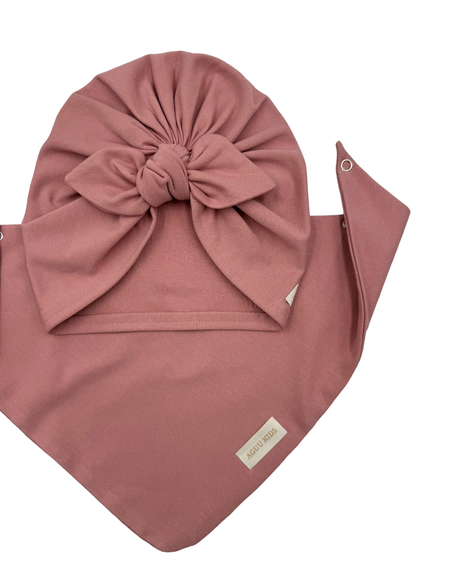 Zestaw uszyty jest z tkaniny posiadającej certyfikat OEKO-TEX, elastan zawarty w tkaninie sprawia, że turban idealnie dopasowuje się do głowy.