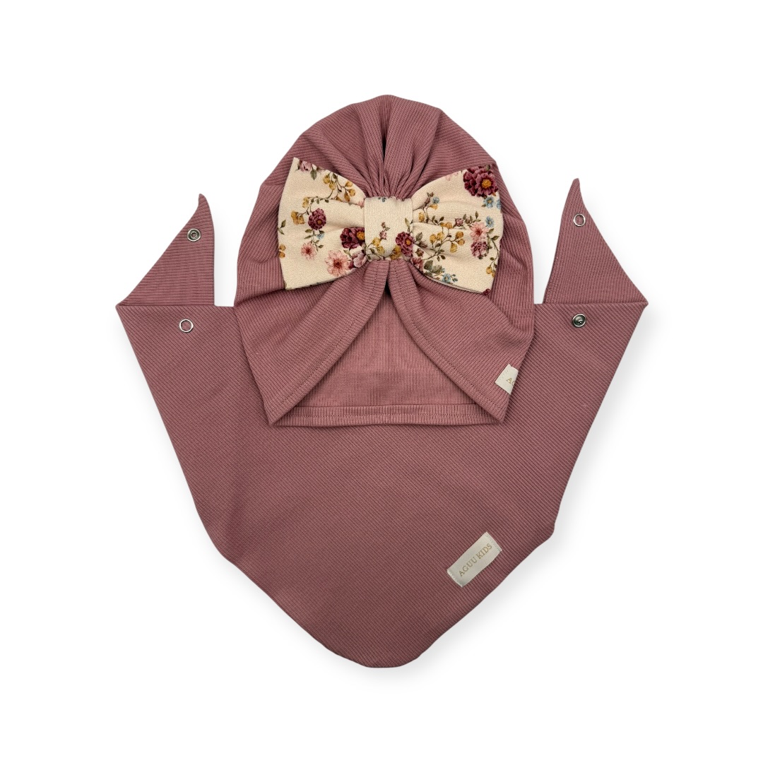 Wiosenny zestaw turban z kwiatową kokardą + chusta brudny róż