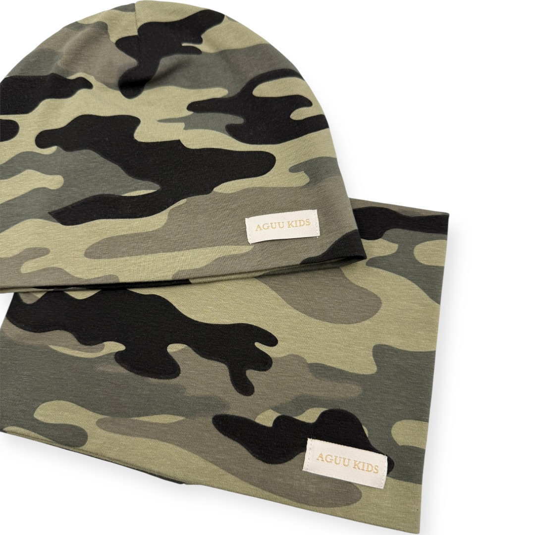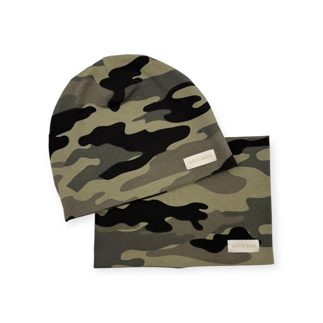 Bawełniany komplet dziecięcy czapka i komin w modny wzór moro. Wygodny, elastyczny zestaw idealny na wiosnę i jesień dla chłopca.